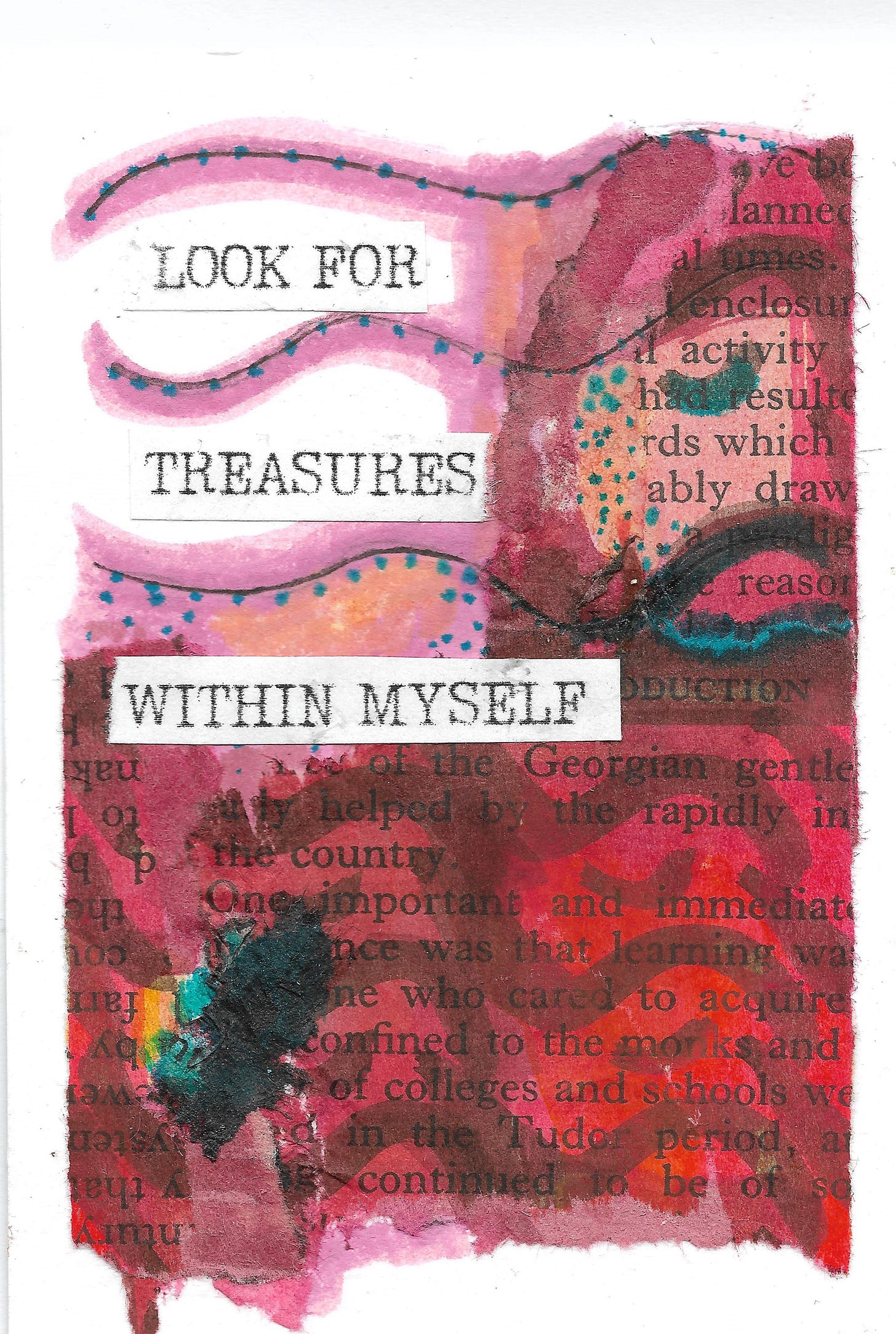 Card number 19 from the pack of 50, “look for treasures within myself”. The words come from Elizabeth Gilbert’s book about Big Magic. The art is a collage of old book papers, which I’ve then stained with colour.